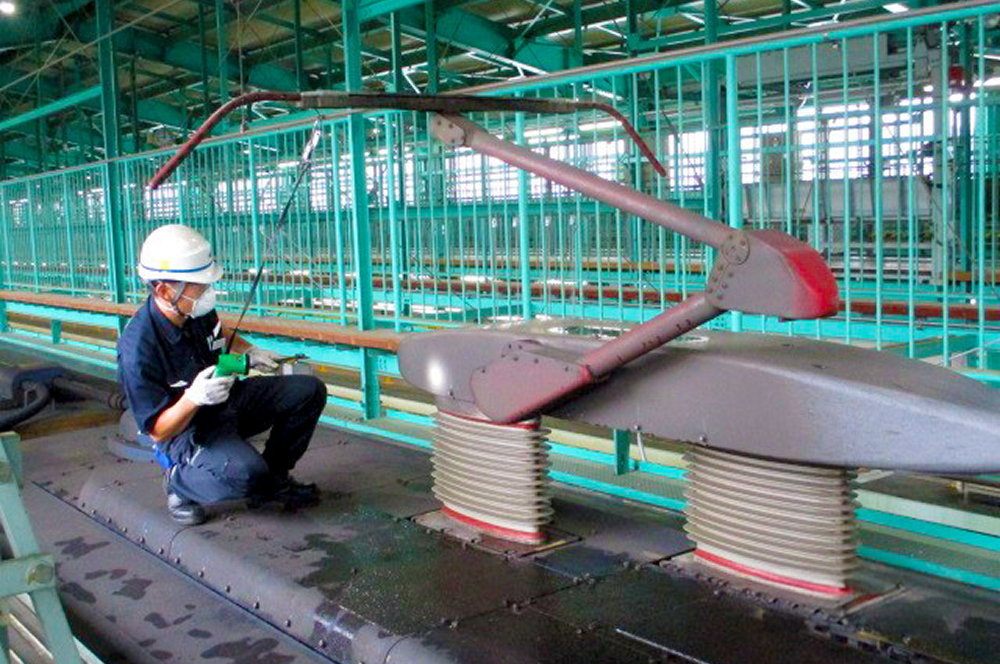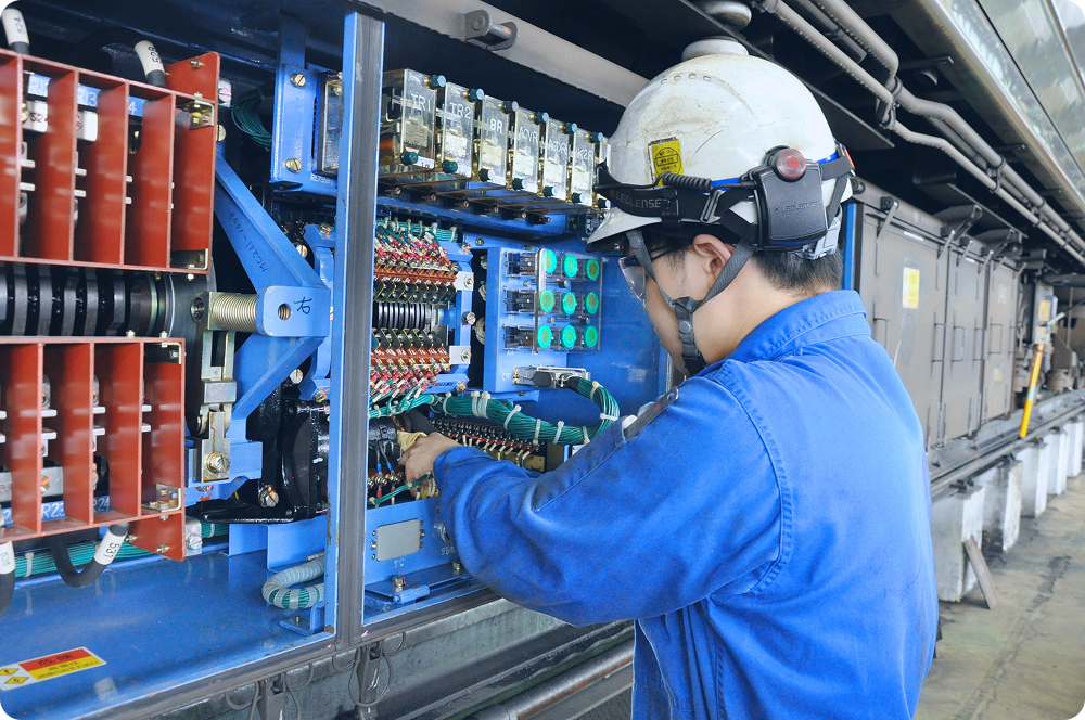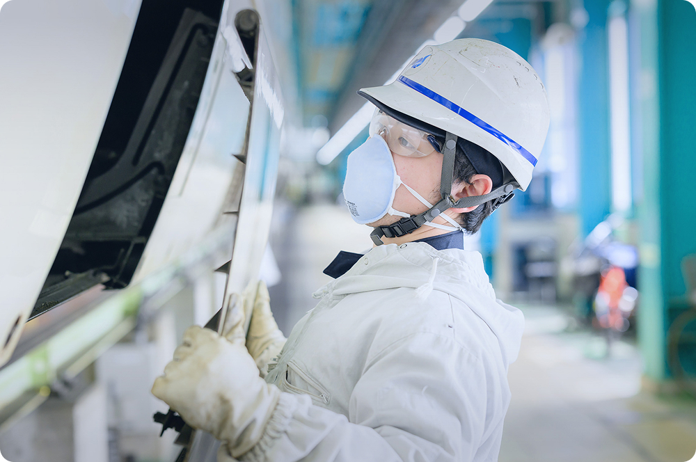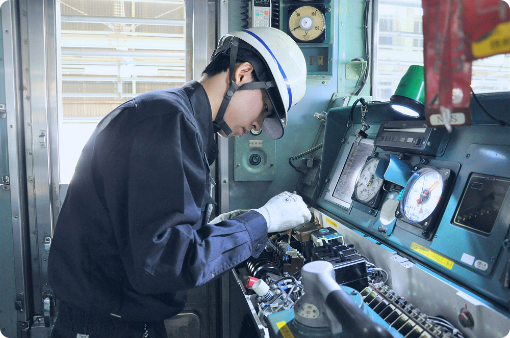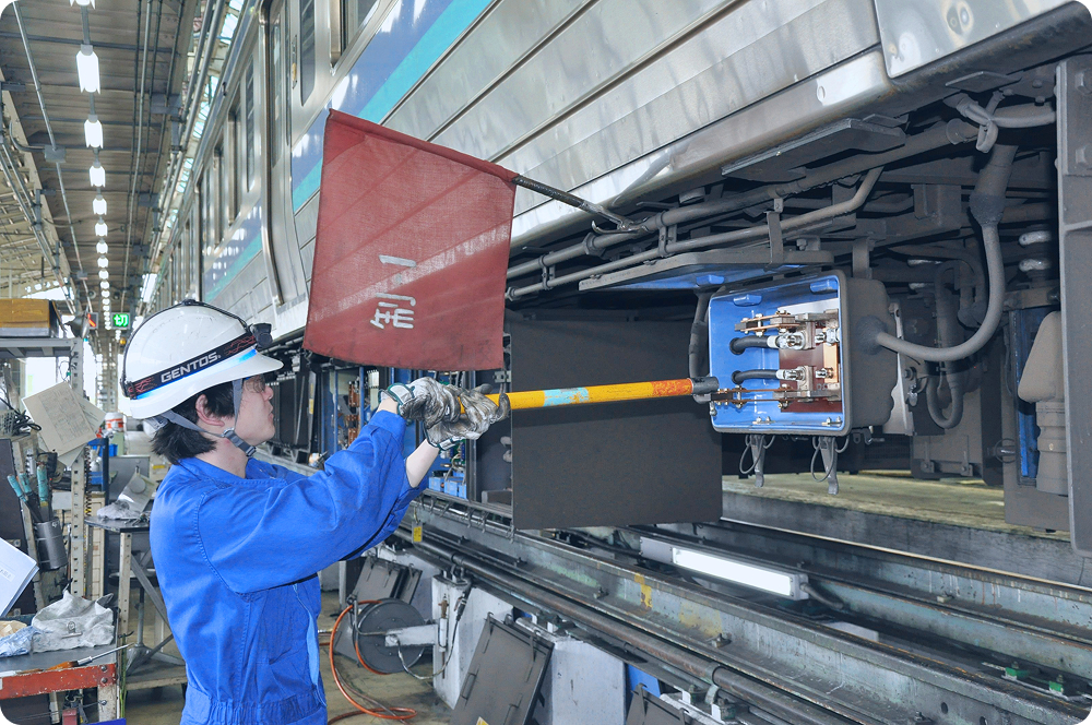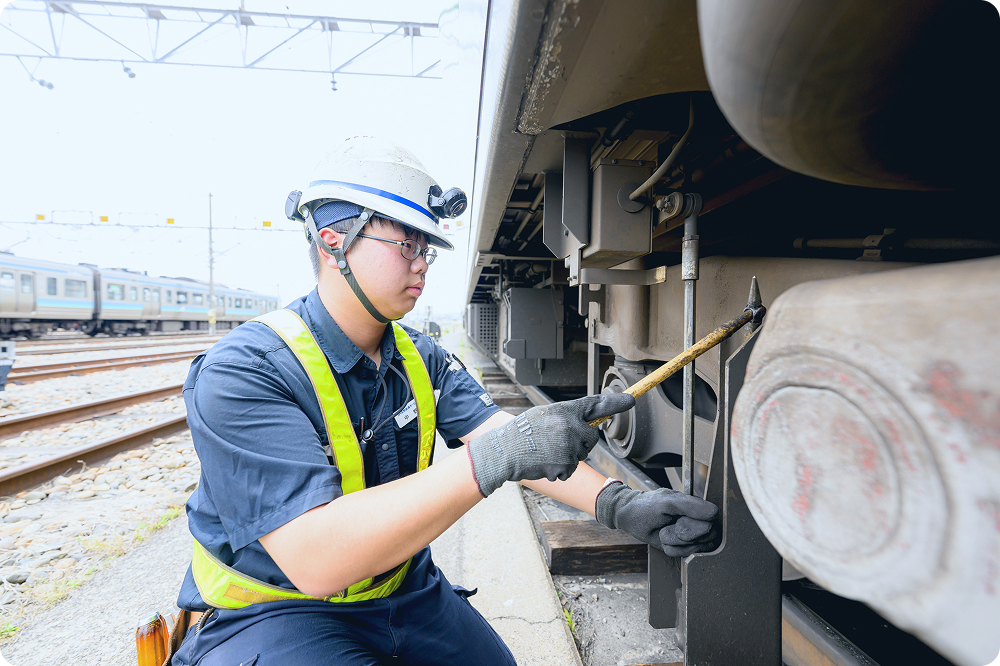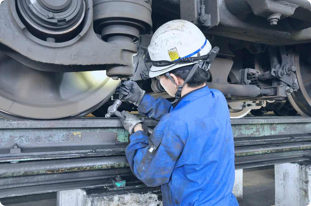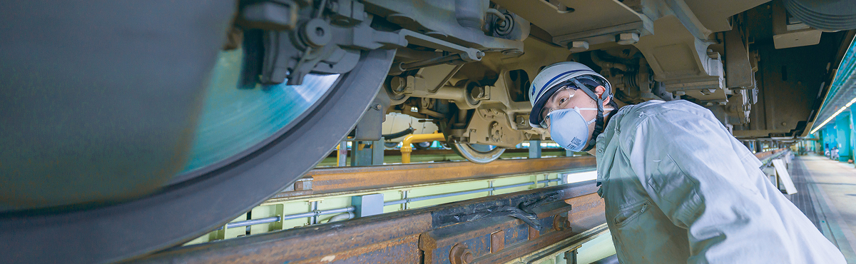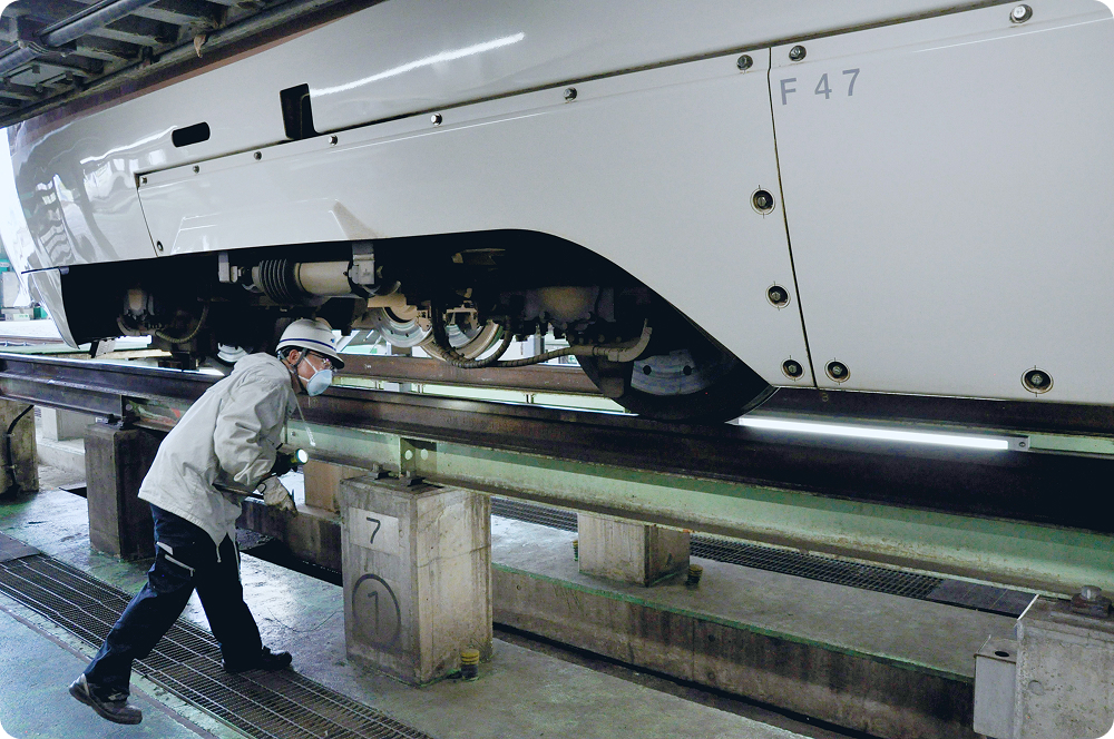 究極の安全追求とサービス品質の向上が、私たちの使命。その根幹ともいうべき事業が、車両基地における鉄道車両の検査と、不具合部分をメンテナンスする業務です。90日に1回行う交番検査と、9日を超えない期間で行う仕業検査があります。