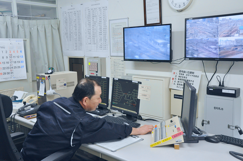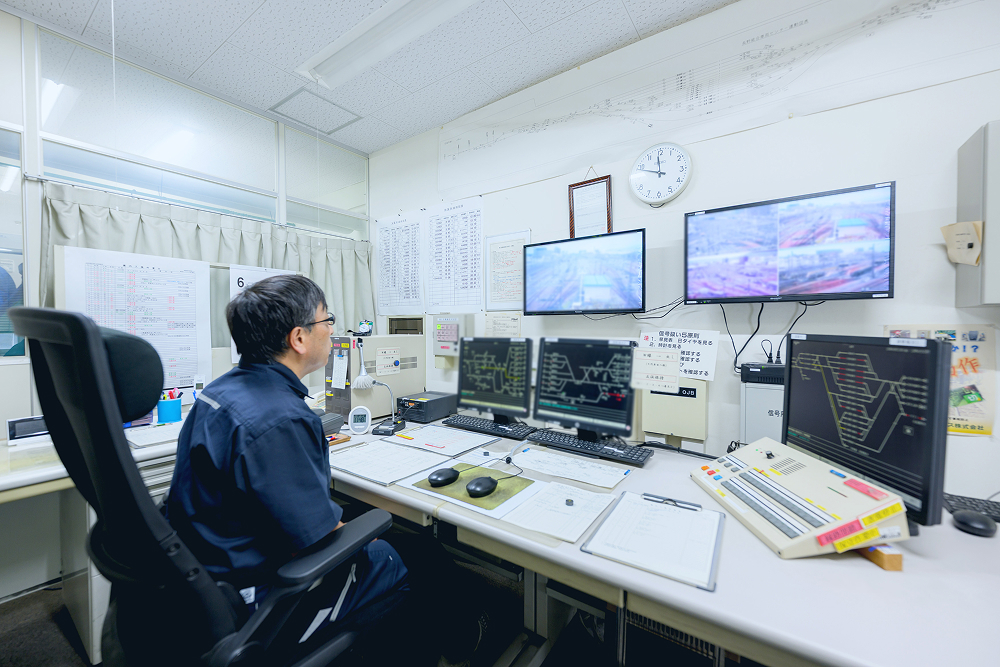 構内の映像やモニターで車両の様子を監視し、ポイントを操作することにより車両が通るルートを構成しています。