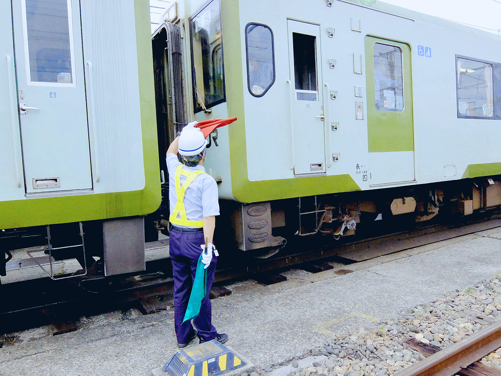 車両の移動、解放・連結時には、運転士に旗等で合図を送ります。