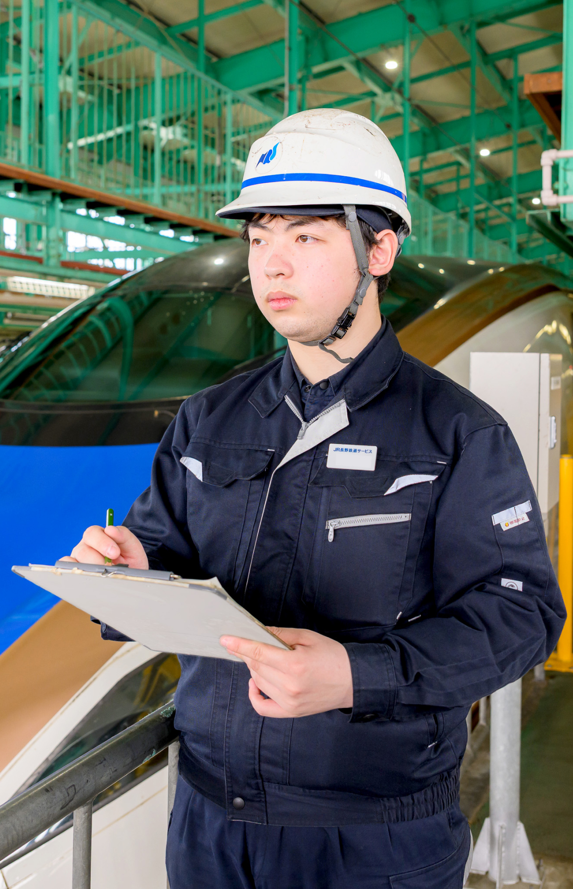 子どもの頃から鉄道に乗るのが好きで、鉄道に関連する仕事に携わることが夢だったんです。就職活動を始めようというタイミングで、高校にJR長野鉄道サービスの求人票が届いていて、「これだ!」って思いました。実は高校のOBが多く在籍していたことも決め手。現在の主な仕事は、新幹線車両のメンテナンス業務で、90日に1回必要な交番検査と、9日以内に1度実施するブレーキなどの基本的な機能チェックや消耗品の交換などを行う仕業検査。現在は、朝出勤し、途中で仮眠をはさみつつ翌朝まで勤務する夜勤がメインです。